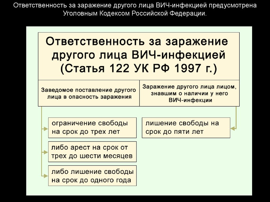 Ответственность за заражение другого лица ВИЧ-инфекцией предусмотренаУголовным Кодексом Российской Федерации.