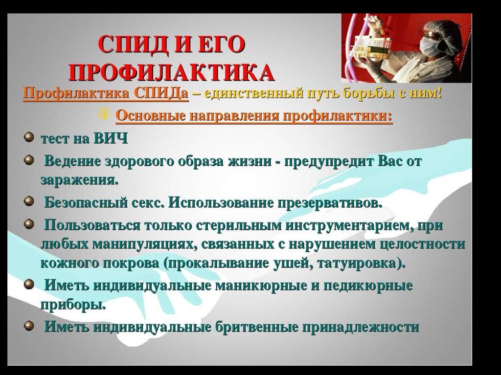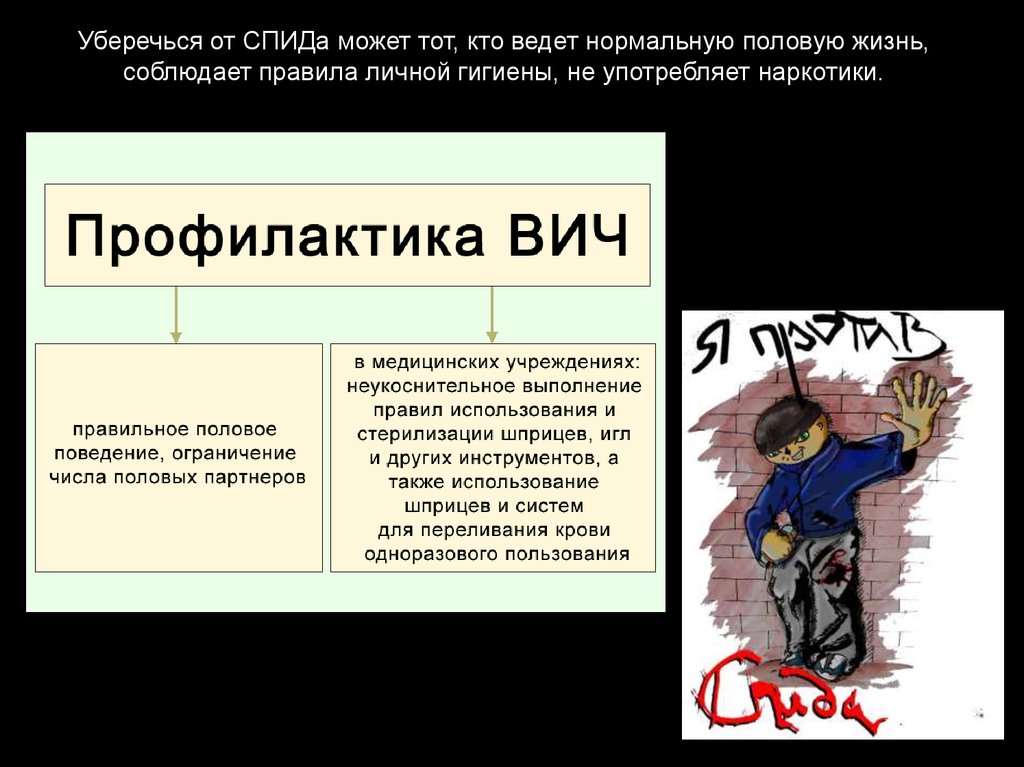Уберечься от СПИДа может тот, кто ведет нормальную половую жизнь,соблюдает правила личной гигиены, не употребляет наркотики.