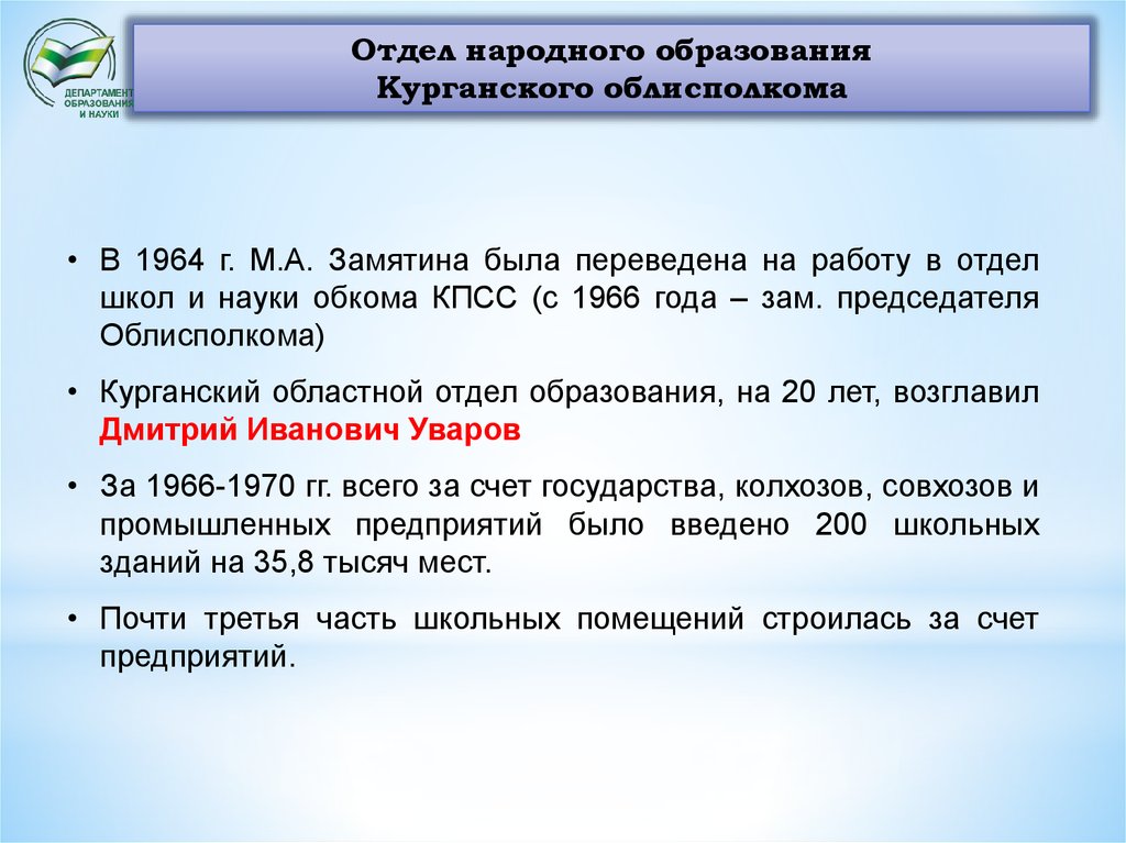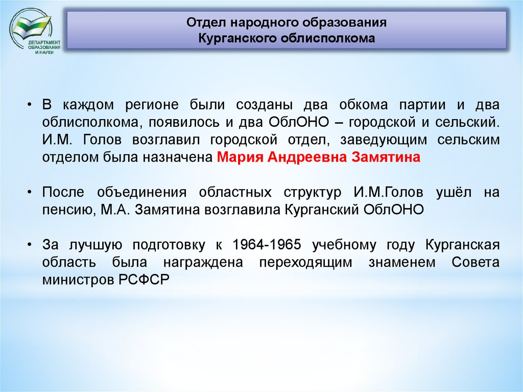 пенсию, М.А. Замятина возглавила Курганский ОблОНО