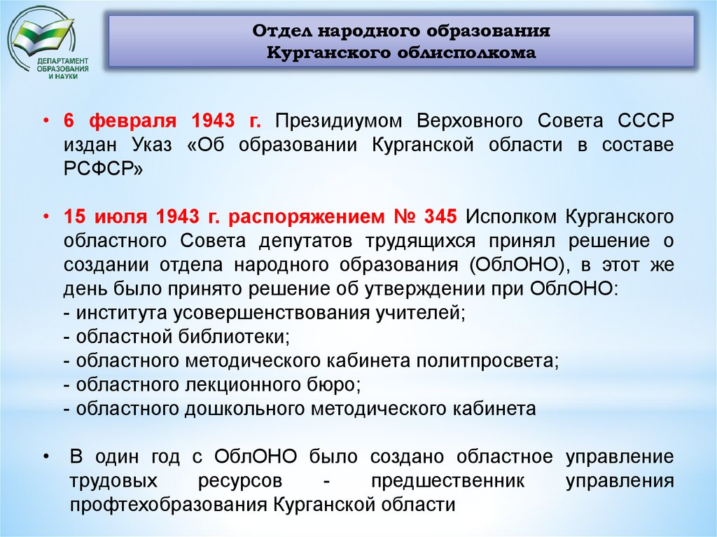Отдел народного образованияКурганского облисполкома – два ОблОНО