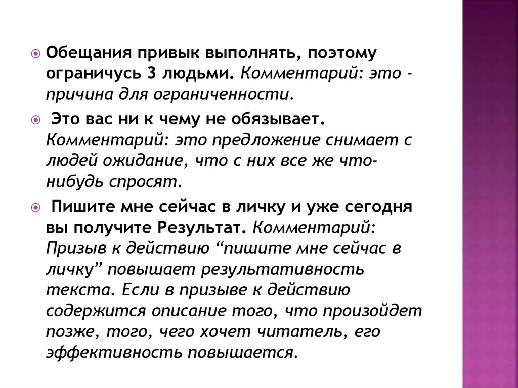Обещания привык выполнять, поэтомуограничусь 3 людьми. Комментарий: это причина для ограниченности.