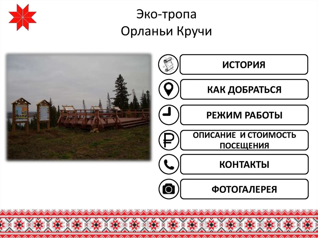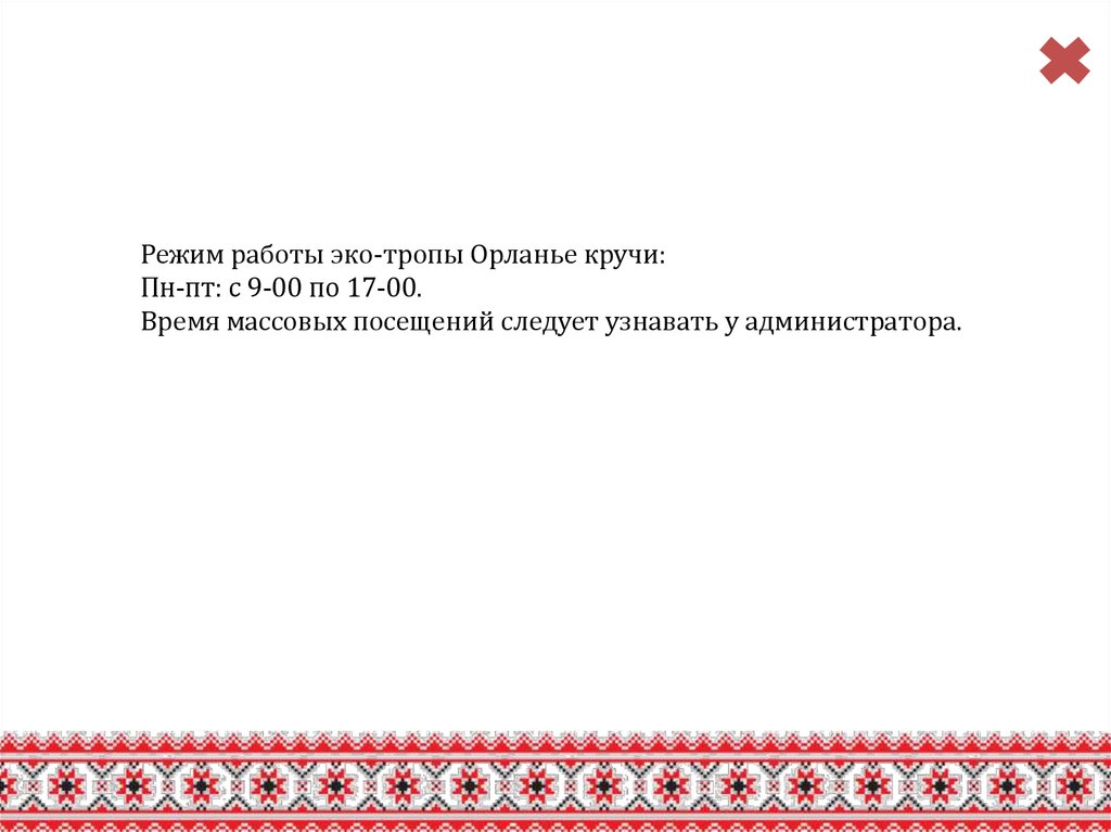 Режим работы эко-тропы Орланье кручи:Пн-пт: с 9-00 по 17-00.