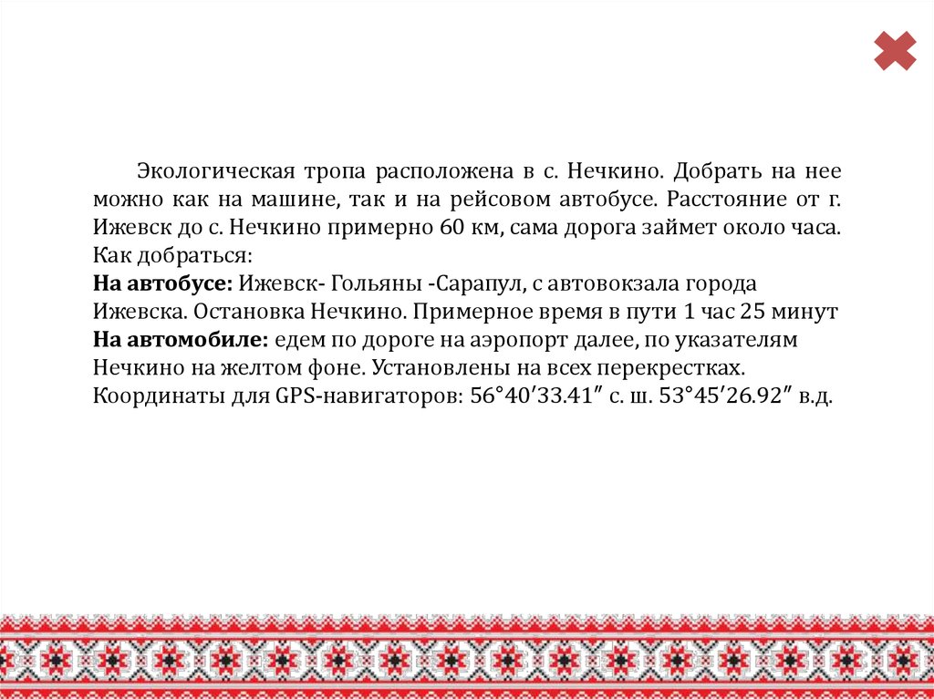 Экологическая тропа расположена в с. Нечкино. Добрать на нееможно как на машине, так и на рейсовом автобусе. Расстояние от г.