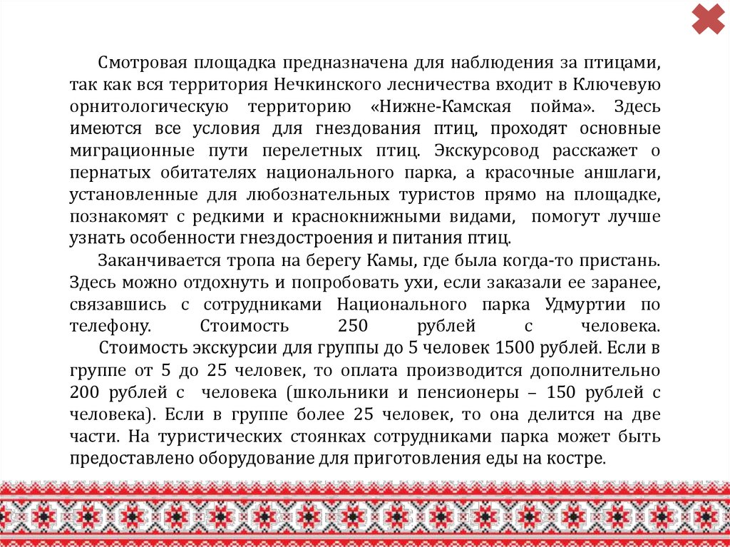 Смотровая площадка предназначена для наблюдения за птицами,так как вся территория Нечкинского лесничества входит в Ключевую