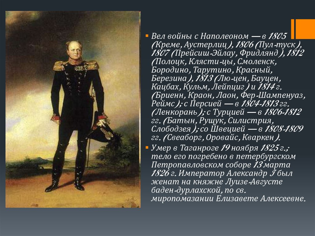 Вел войны с Наполеоном — в 1805(Креме, Аустерлиц), 1806 (Пул-туск),