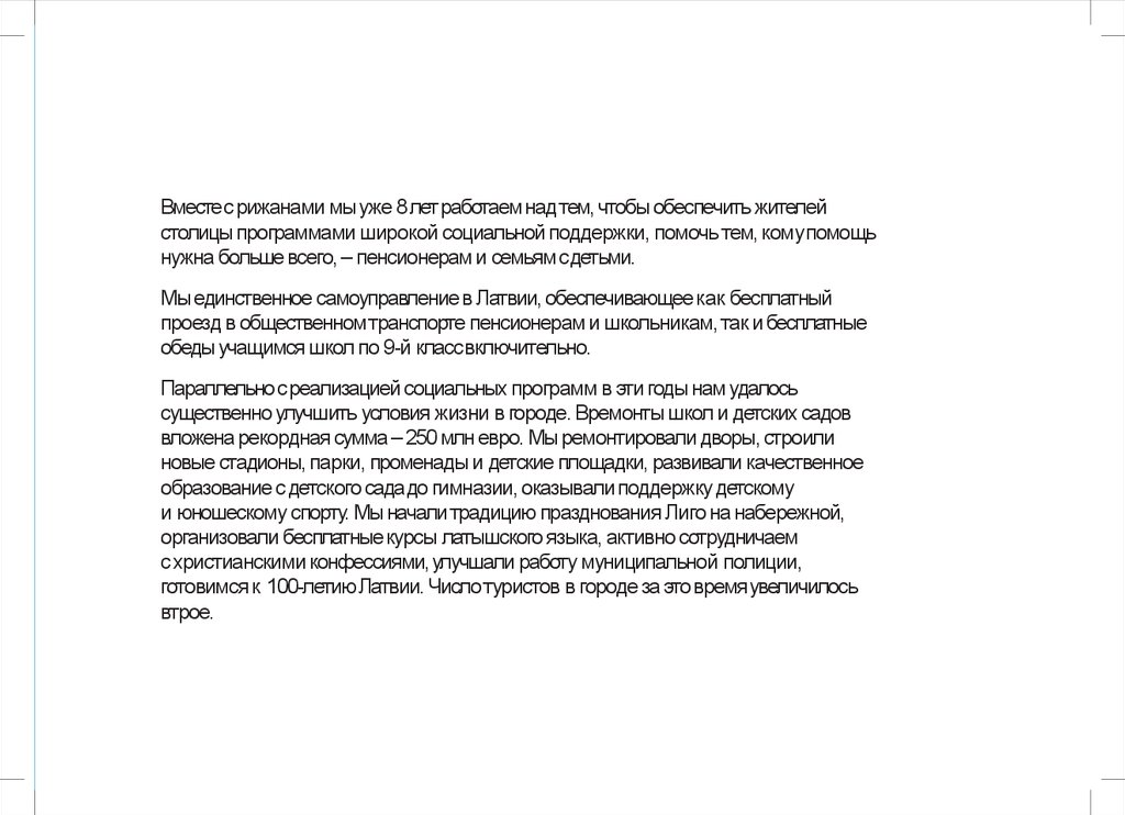 На этих выборах мы не обещаем ничего такого, что до сих пор не было бы доказаноработой. Мы заверяем рижан, что жестко продолжим все ранее начатые программы