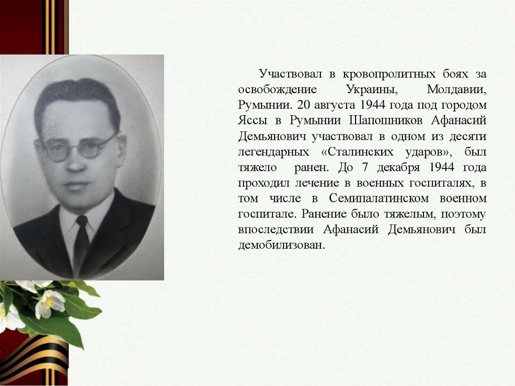 тяжело ранен. До 7 декабря 1944 года