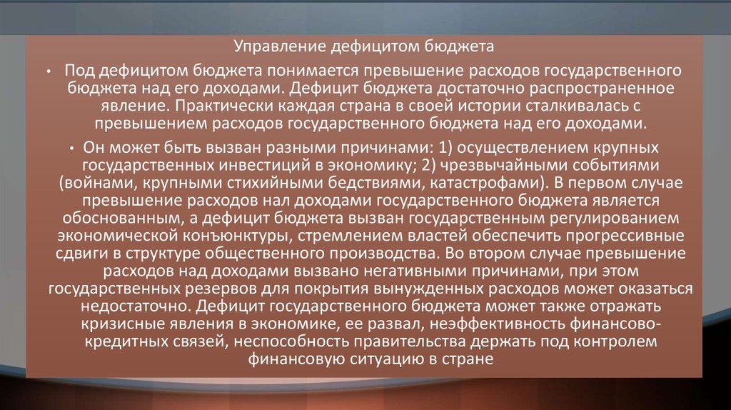Управление дефицитом бюджета• Под дефицитом бюджета понимается превышение расходов государственного