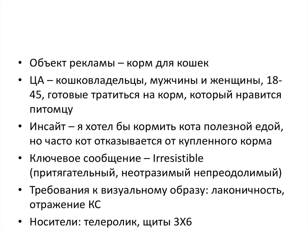 • Объект рекламы – корм для кошек• ЦА – кошковладельцы, мужчины и женщины, 1845, готовые тратиться на корм, который нравится