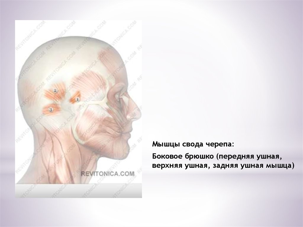 Мышцы свода черепа:Боковое брюшко (передняя ушная,