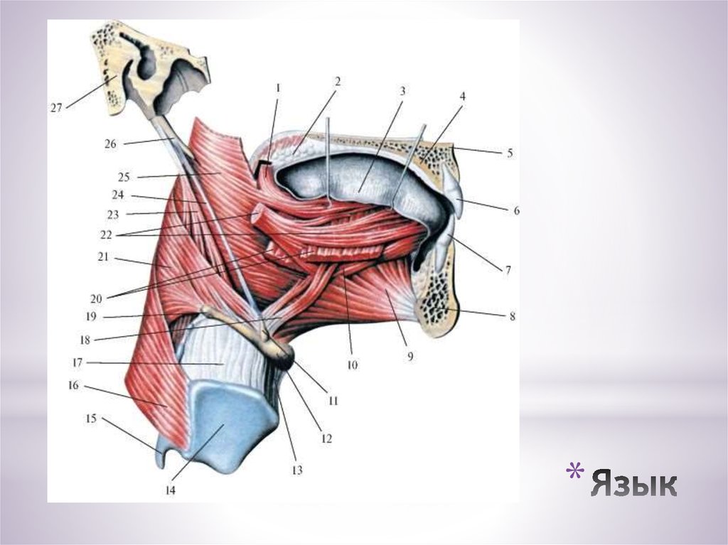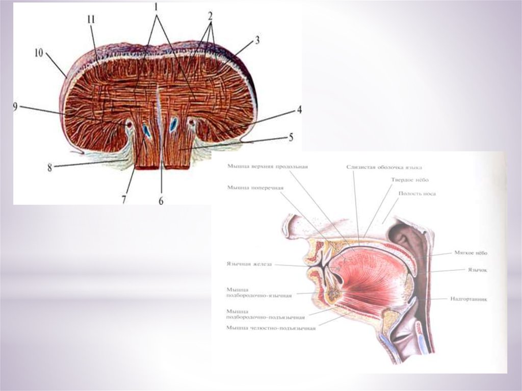 32. 1 - верхушка (кончик) языка; 2 - спинка языка; 3 - срединная борозда языка; 4 - желобовидные сосочки; 5 - пограничная борозда;