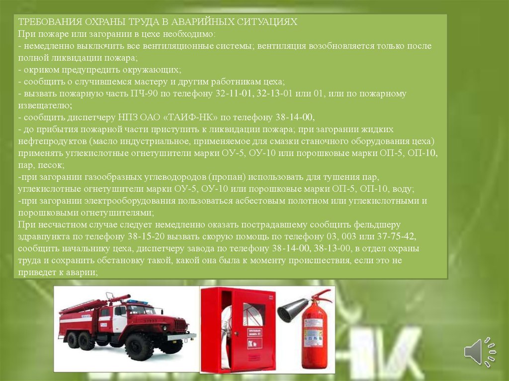 ТРЕБОВАНИЯ ОХРАНЫ ТРУДА В АВАРИЙНЫХ СИТУАЦИЯХПри пожаре или загорании в цехе необходимо: