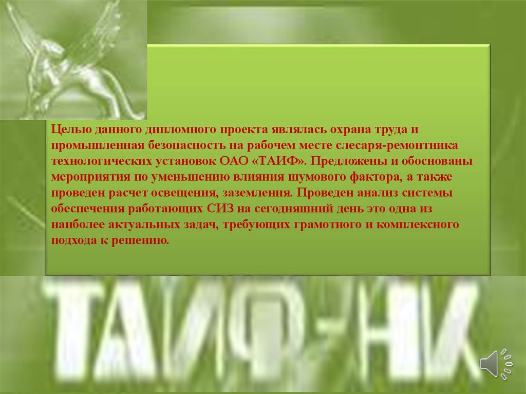 Целью данного дипломного проекта являлась охрана труда ипромышленная безопасность на рабочем месте слесаря-ремонтника