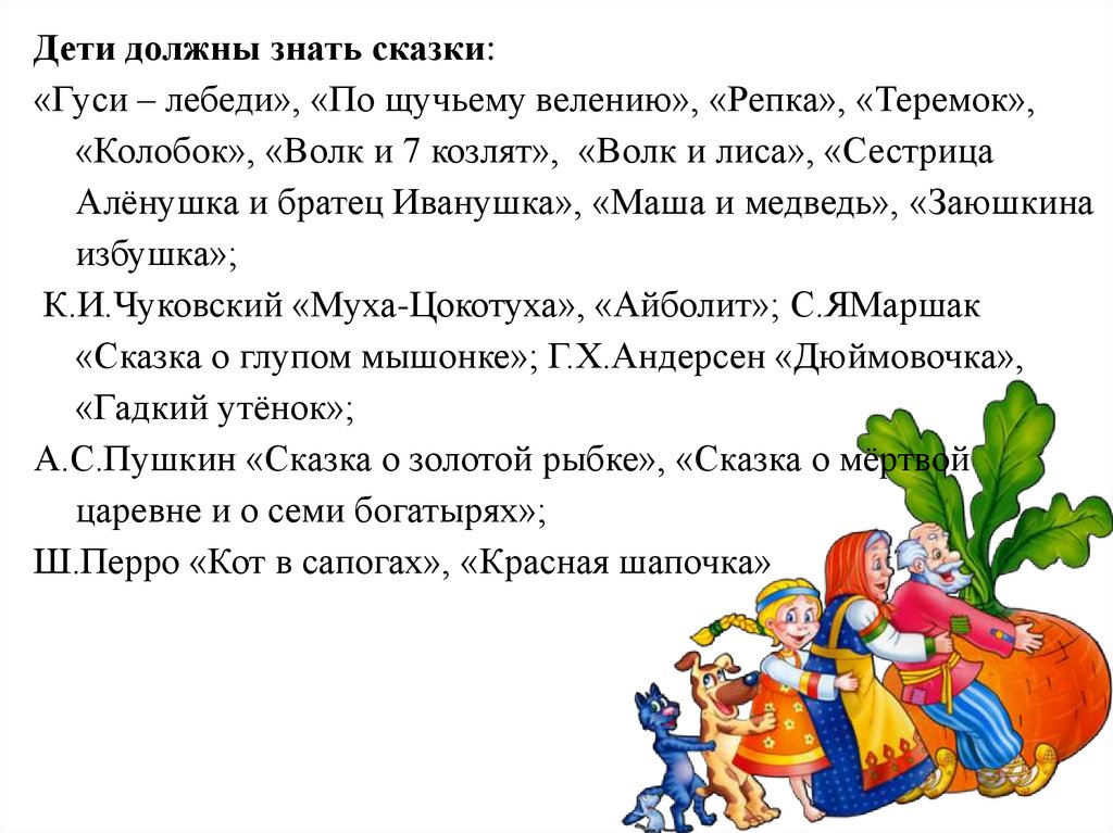 Дети должны знать сказки:«Гуси – лебеди», «По щучьему велению», «Репка», «Теремок»,