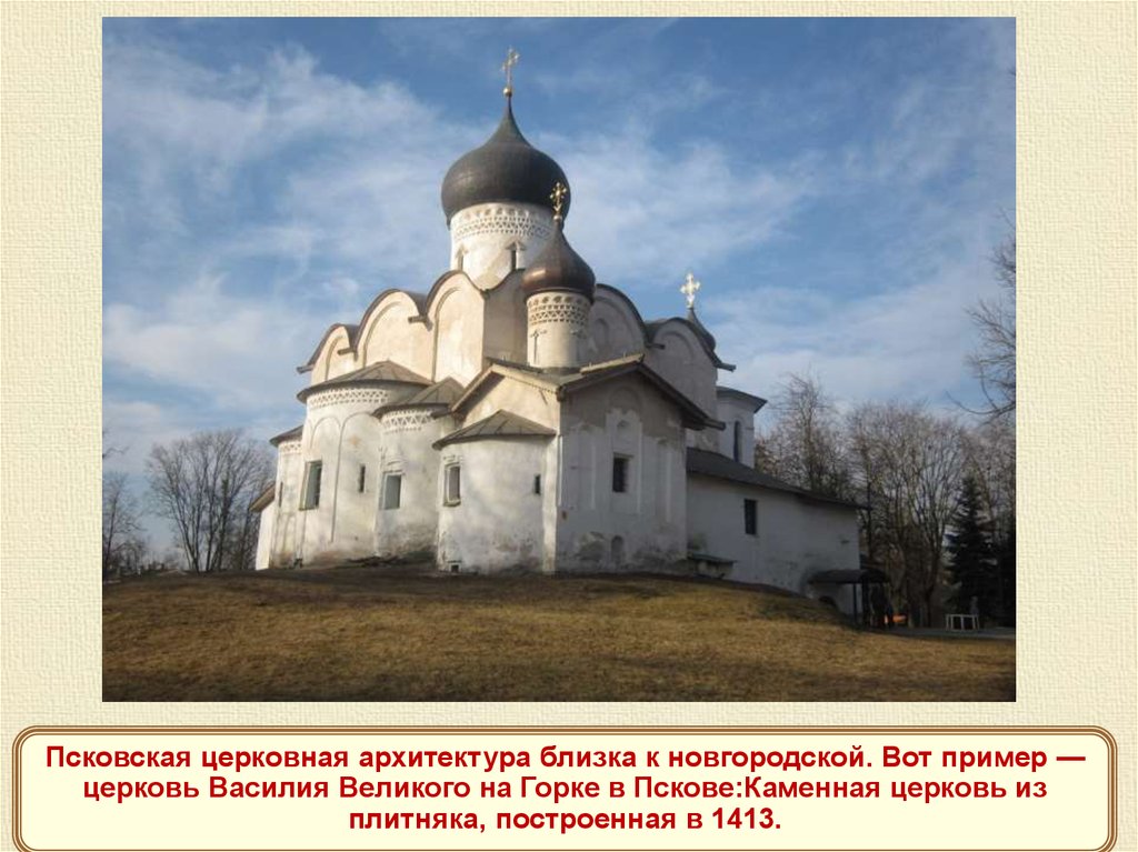 Псковская церковная архитектура близка к новгородской. Вот пример —церковь Василия Великого на Горке в Пскове:Каменная церковь из