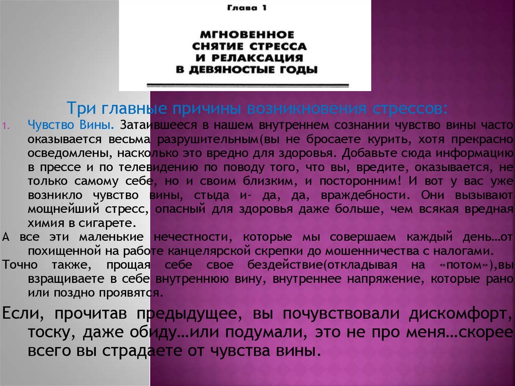 Три главные причины возникновения стрессов:Чувство Вины. Затаившееся в нашем внутреннем сознании чувство вины часто