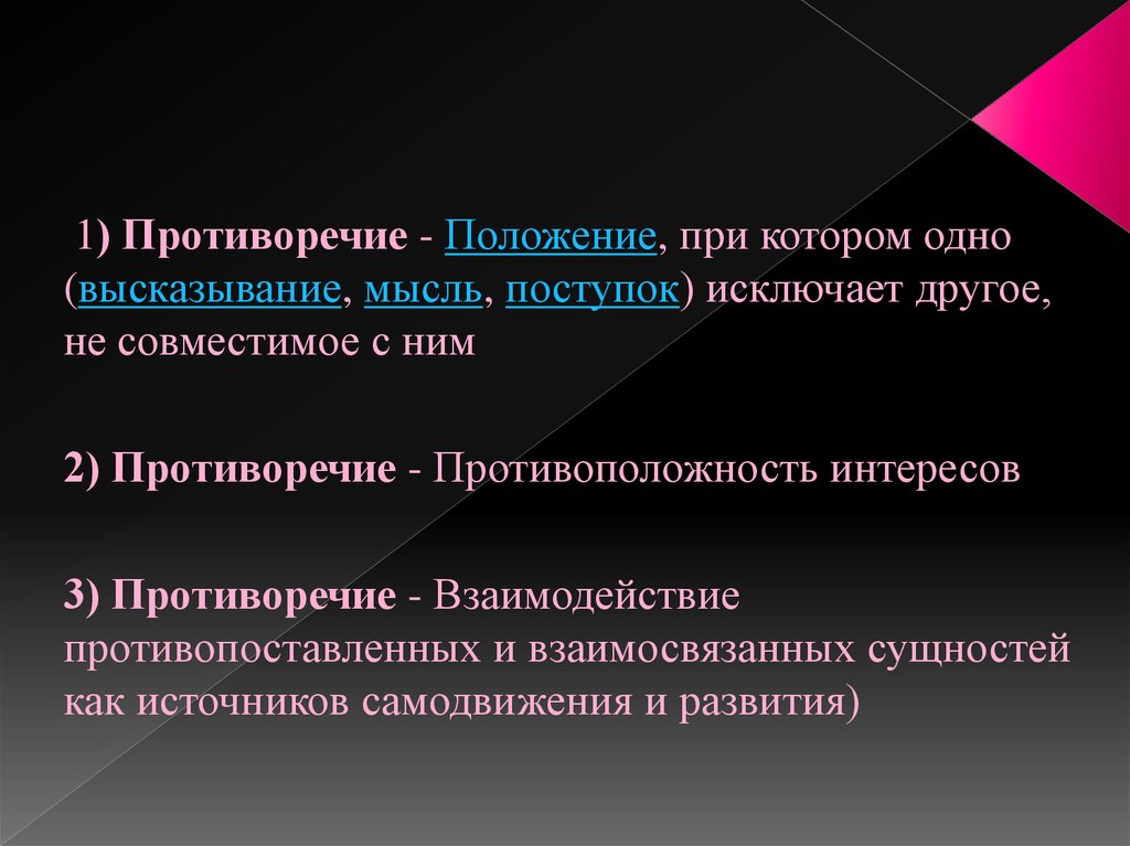 1) Противоречие - Положение, при котором одно(высказывание, мысль, поступок) исключает другое,