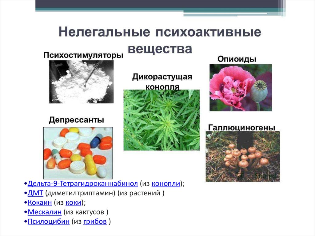 •Дельта-9-Тетрагидроканнабинол (из конопли);•ДМТ (диметилтриптамин) (из растений )
