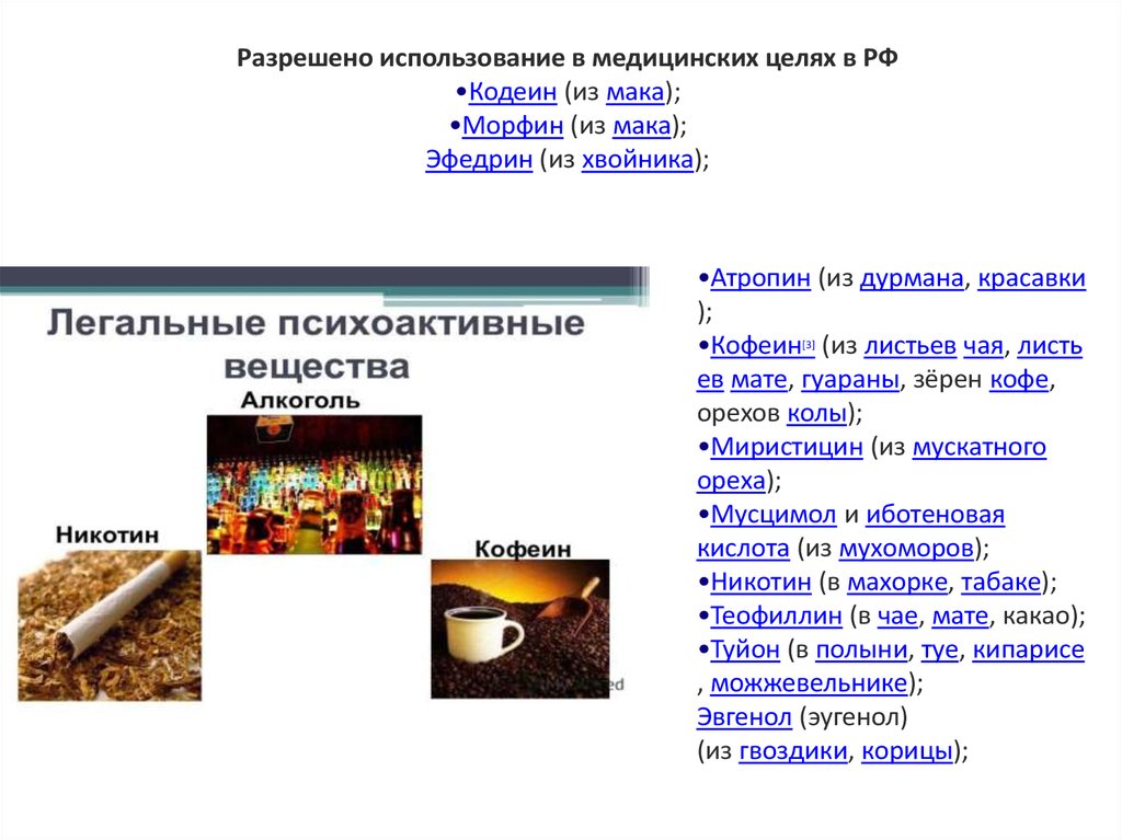 Разрешено использование в медицинских целях в РФ•Кодеин (из мака);