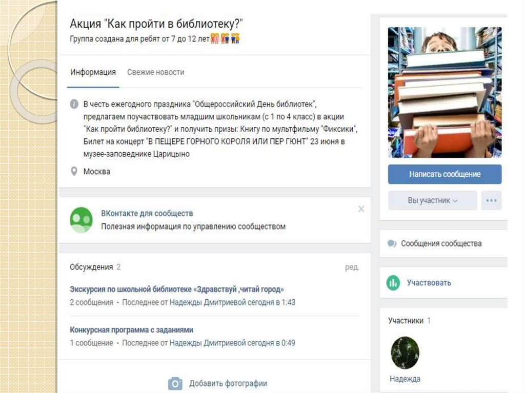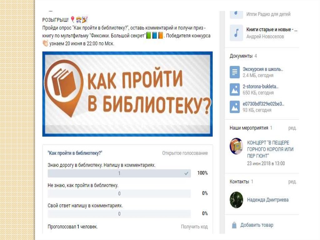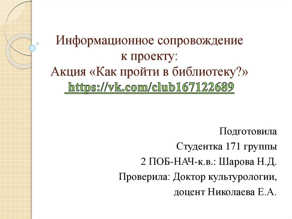 1. Информационное сопровождение к проекту: Акция «Как пройти в библиотеку?» https://vk.com/club167122689