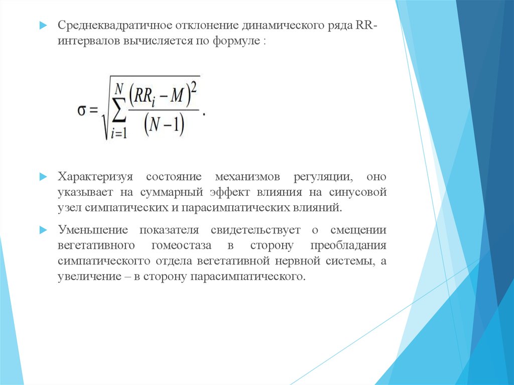 Среднеквадратичное отклонение динамического ряда RRинтервалов вычисляется по формуле :Характеризуя состояние механизмов регуляции, оно
