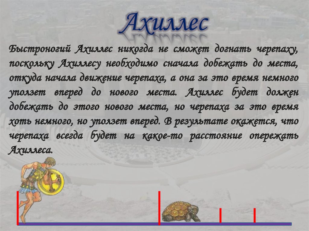 АхиллесБыстроногий Ахиллес никогда не сможет догнать черепаху,
