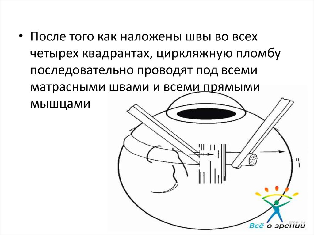 • После того как наложены швы во всехчетырех квадрантах, циркляжную пломбу