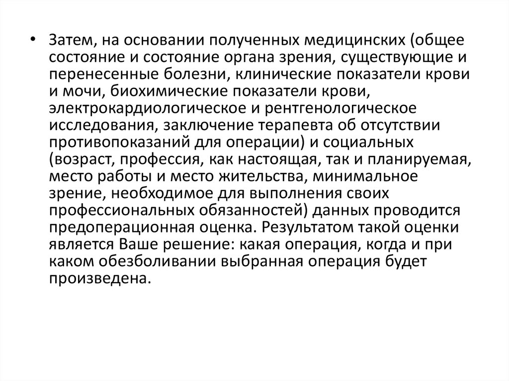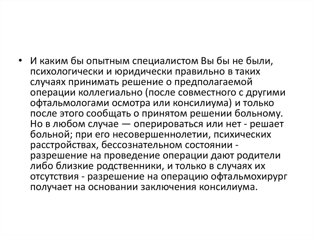 • Сам офтальмохирург и пациент должны точнопредставлять цель операции, которая, во