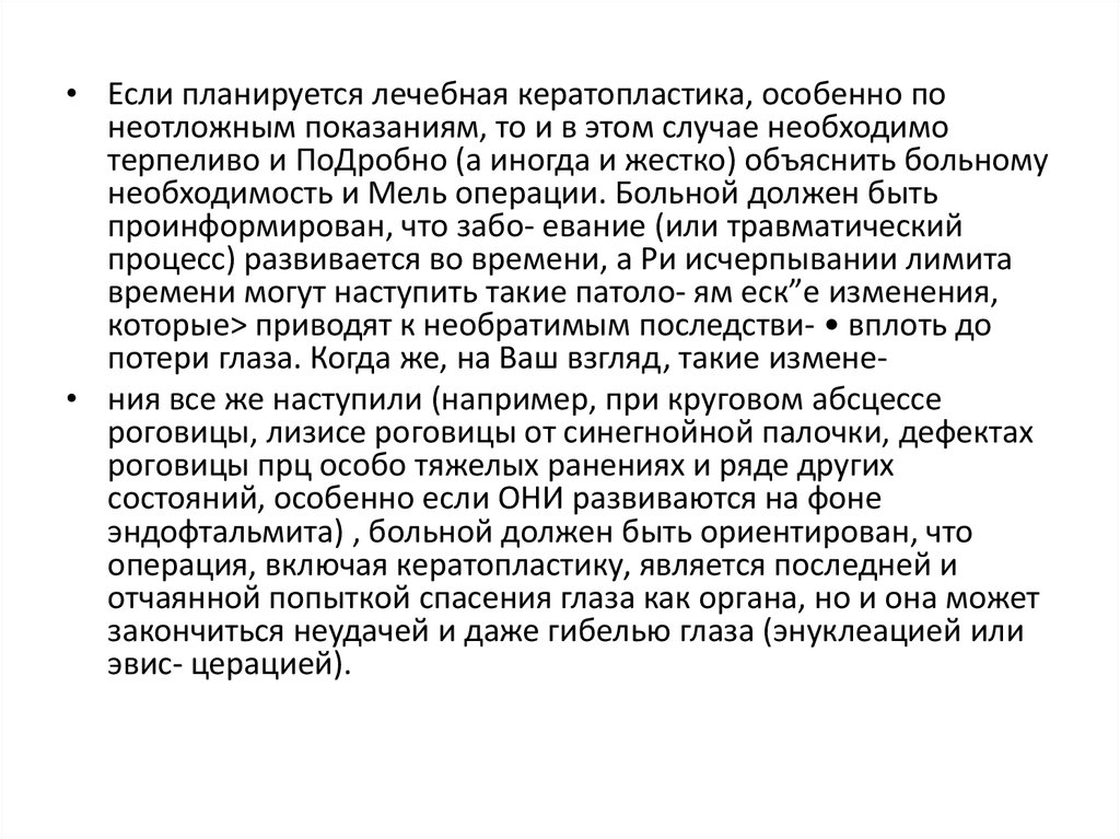 • Если планируется лечебная кератопластика, особенно понеотложным показаниям, то и в этом случае необходимо