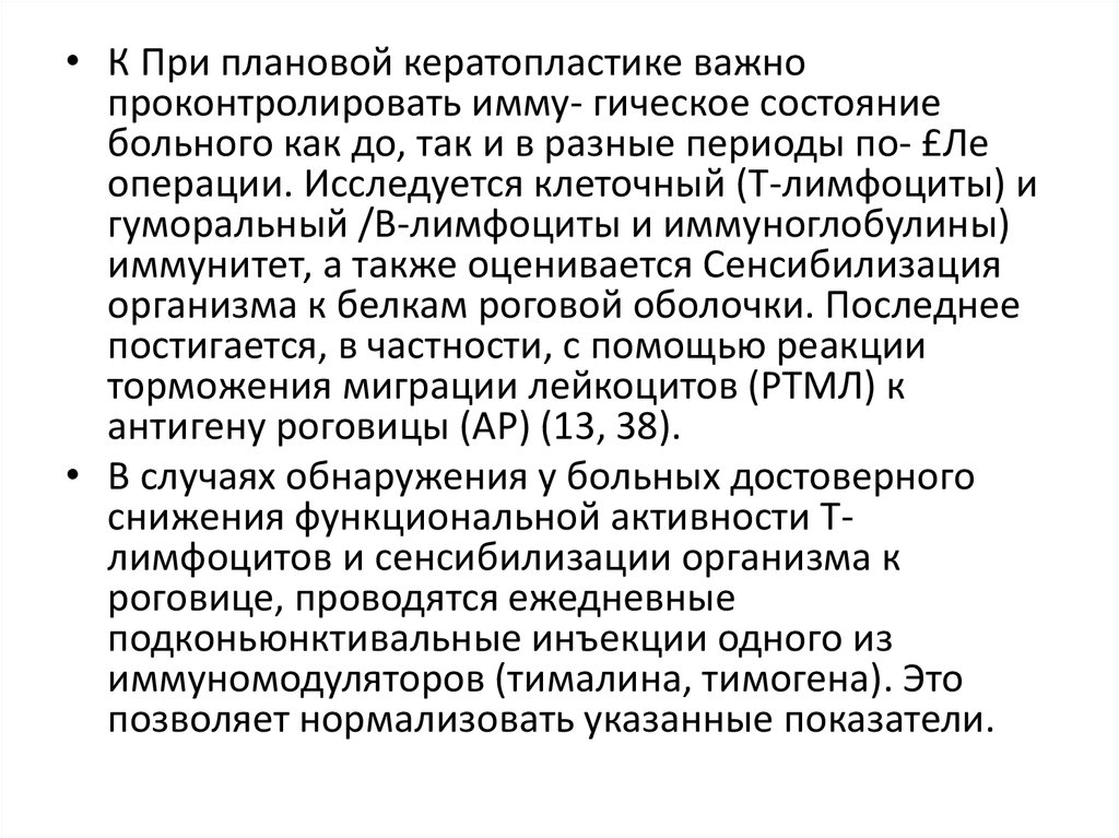 • К При плановой кератопластике важнопроконтролировать имму- гическое состояние