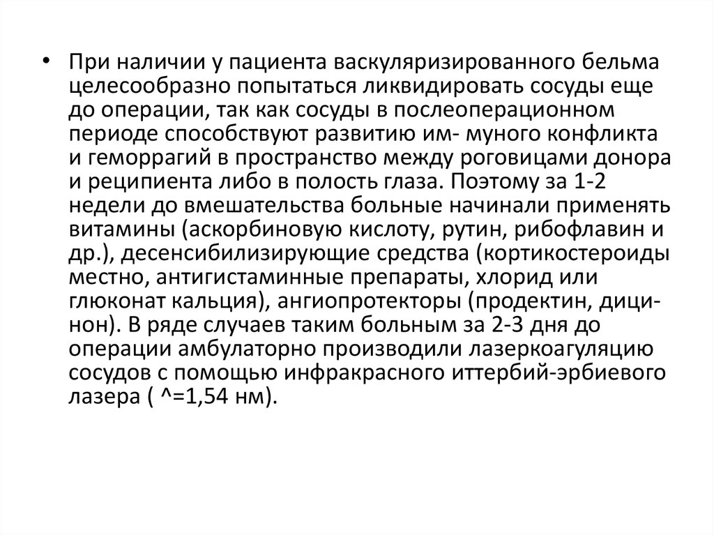 • При наличии у пациента васкуляризированного бельмацелесообразно попытаться ликвидировать сосуды еще