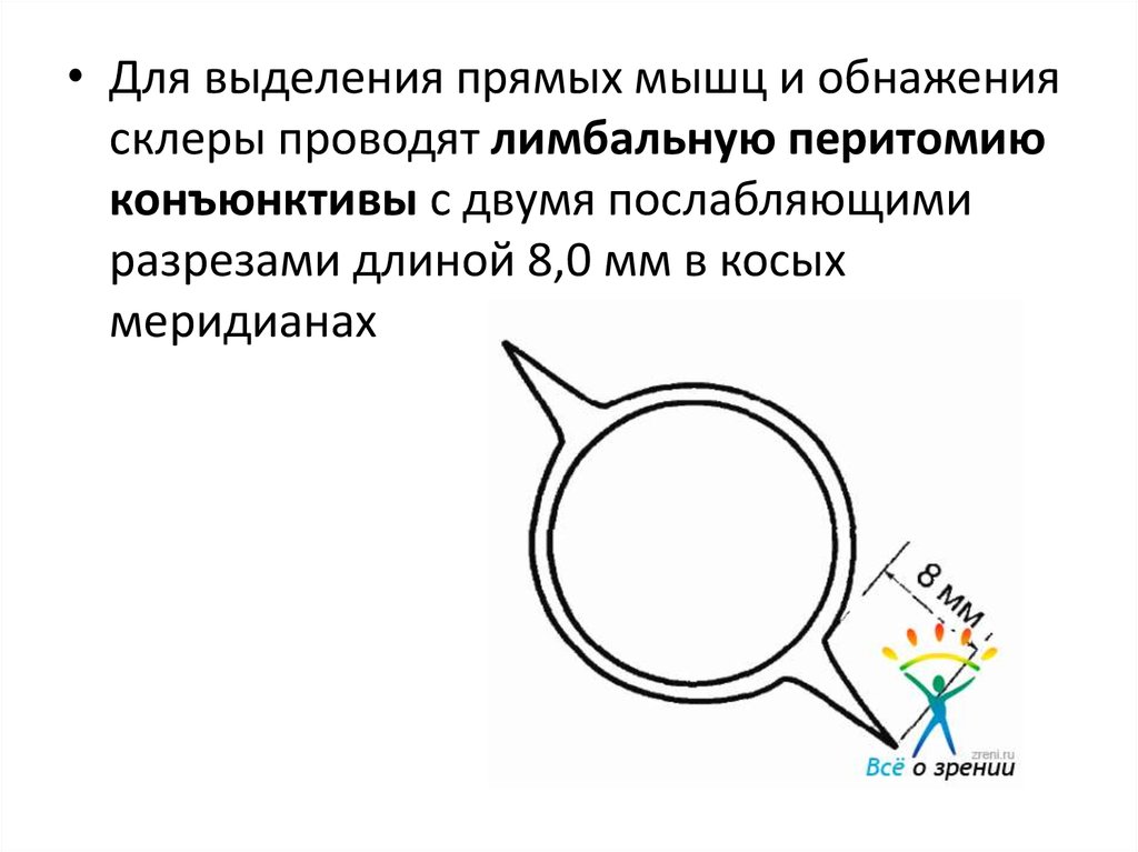 • Для выделения прямых мышц и обнажениясклеры проводят лимбальную перитомию