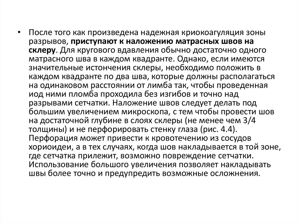 • После того как произведена надежная криокоагуляция зоныразрывов, приступают к наложению матрасных швов на