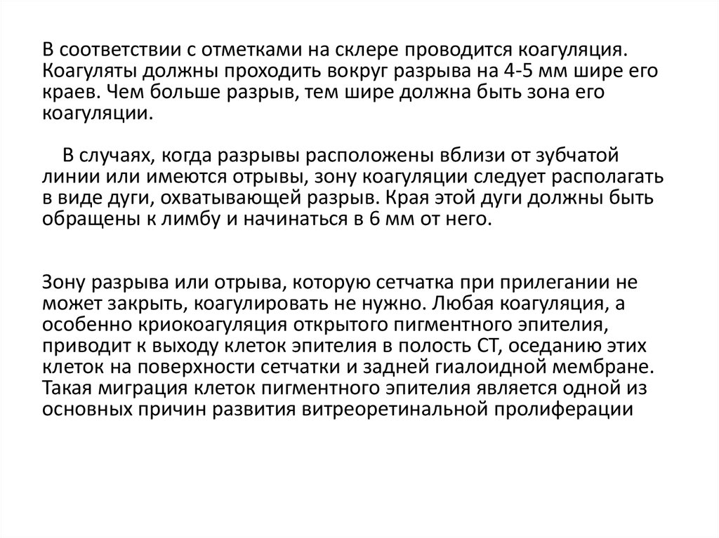 В соответствии с отметками на склере проводится коагуляция.Коагуляты должны проходить вокруг разрыва на 4-5 мм шире его