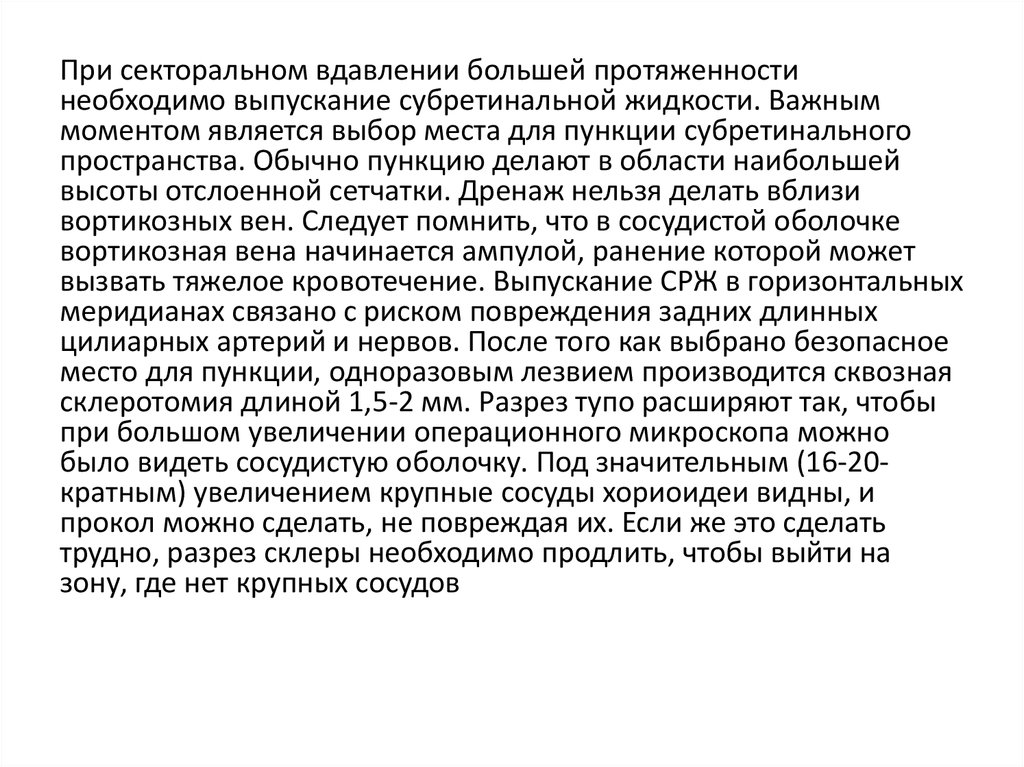 При секторальном вдавлении большей протяженностинеобходимо выпускание субретинальной жидкости. Важным
