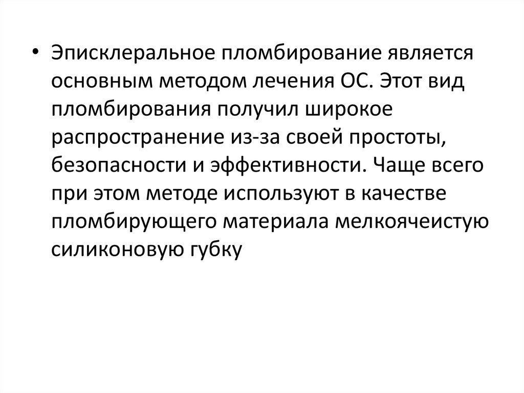 • Эписклеральное пломбирование являетсяосновным методом лечения ОС. Этот вид