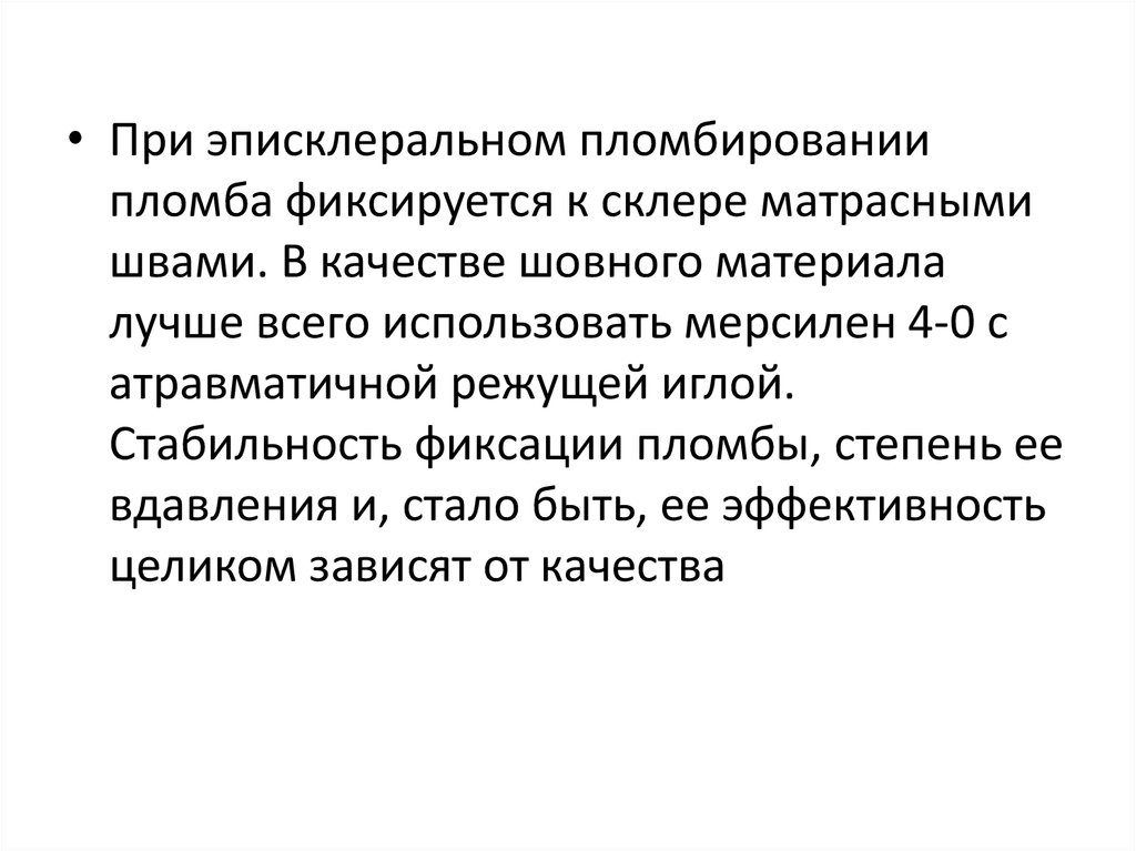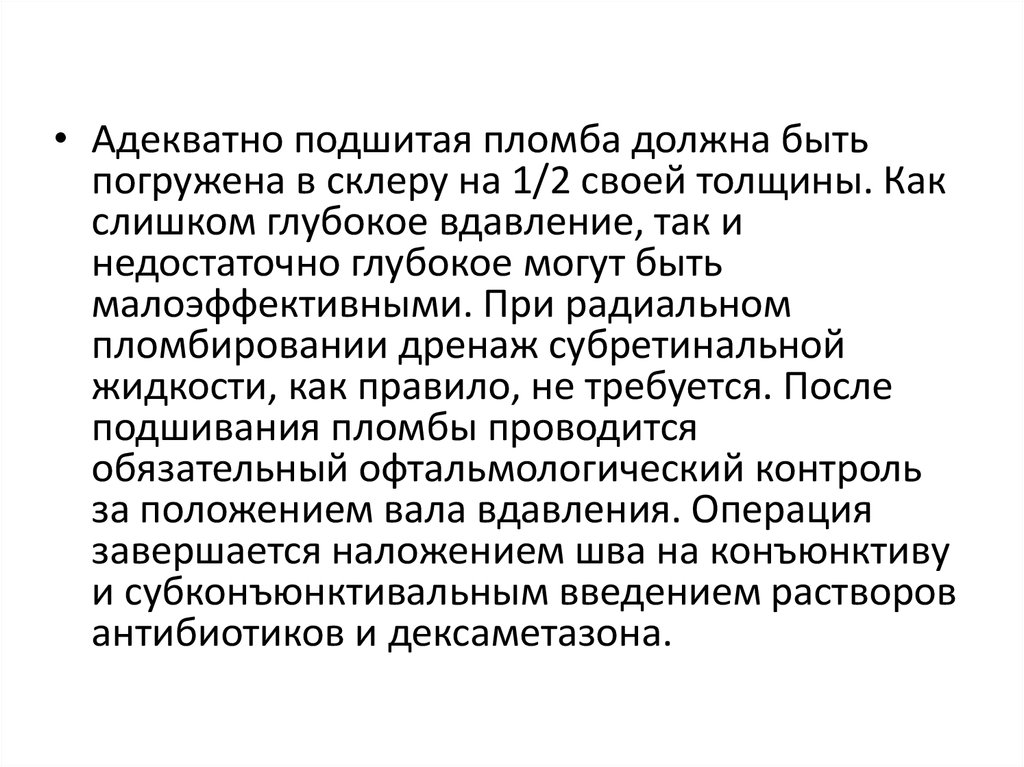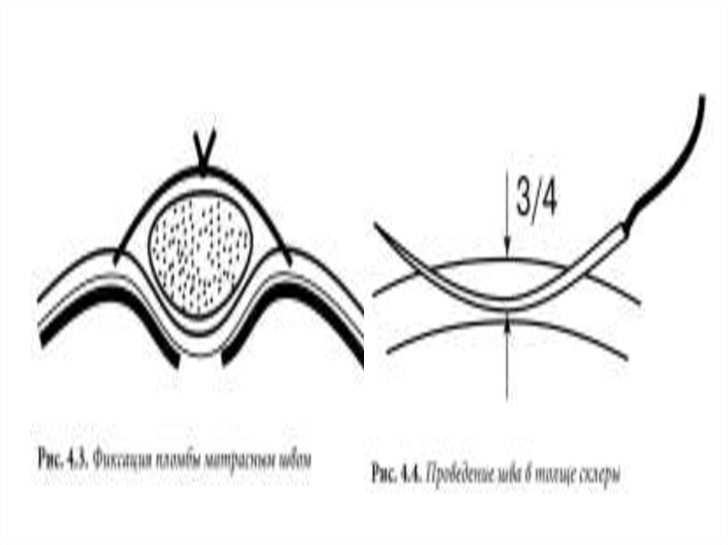 • Адекватно подшитая пломба должна бытьпогружена в склеру на 1/2 своей толщины. Как