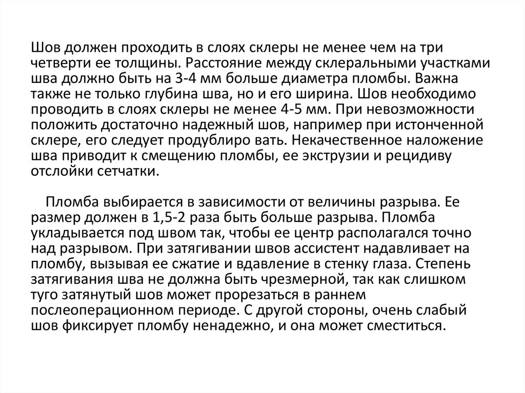 Шов должен проходить в слоях склеры не менее чем на тричетверти ее толщины. Расстояние между склеральными участками
