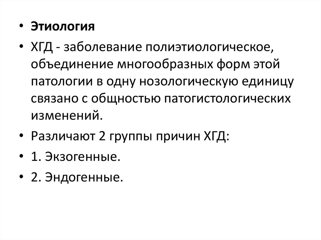 • Таким образом, в этиологии ХГД предусматривают 3основные группы причин, соответственно которым ХГ