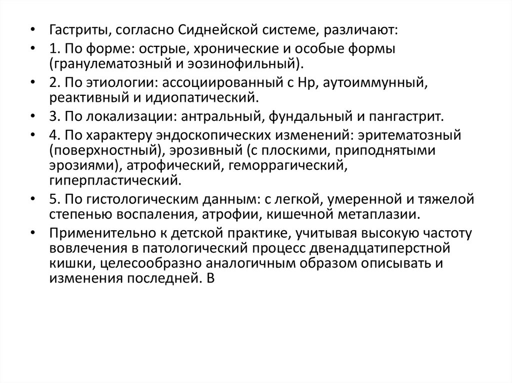 • Гастриты, согласно Сиднейской системе, различают:• 1. По форме: острые, хронические и особые формы