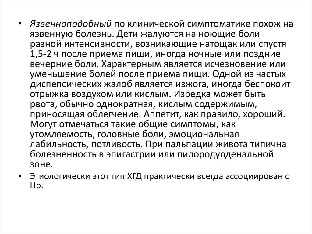 • Язвенноподобный по клинической симптоматике похож наязвенную болезнь. Дети жалуются на ноющие боли