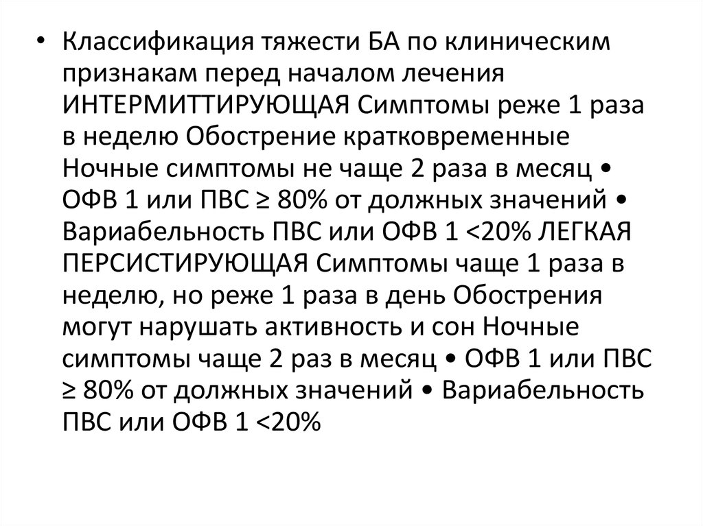 • Классификация тяжести БА по клиническимпризнакам перед началом лечения