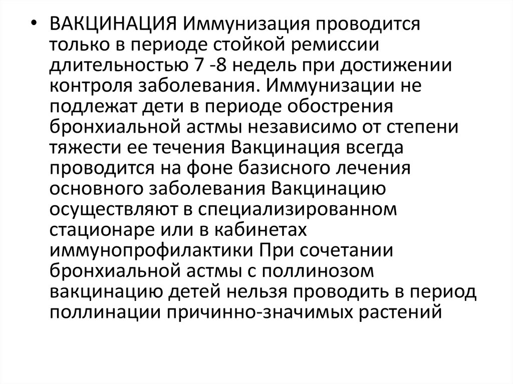 • ВАКЦИНАЦИЯ Иммунизация проводитсятолько в периоде стойкой ремиссии