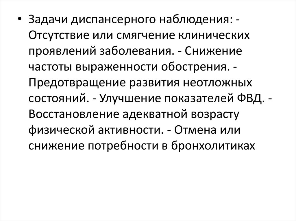 • Задачи диспансерного наблюдения: Отсутствие или смягчение клиническихпроявлений заболевания. - Снижение