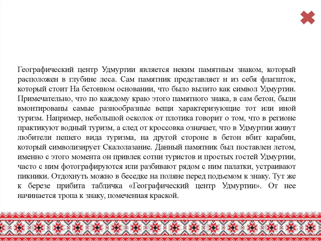 Географический центр Удмуртии является неким памятным знаком, которыйрасположен в глубине леса. Сам памятник представляет н из себя флагшток,