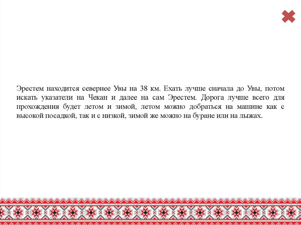 Эрестем находится севернее Увы на 38 км. Ехать лучше сначала до Увы, потомискать указатели на Чекан и далее на сам Эрестем. Дорога лучше всего для