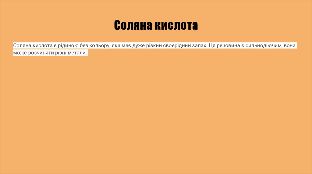 Соляна кислотаСоляна кислота є рідиною без кольору, яка має дуже різкий своєрідний запах. Ця речовина є сильнодіючим, вона