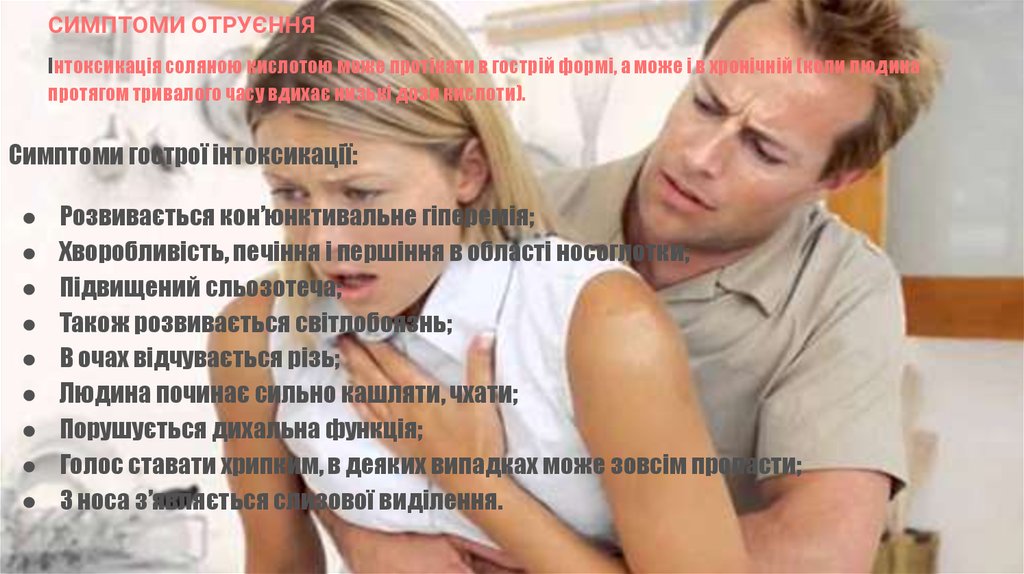 СИМПТОМИ ОТРУЄННЯІнтоксикація соляною кислотою може протікати в гострій формі, а може і в хронічній (коли людина