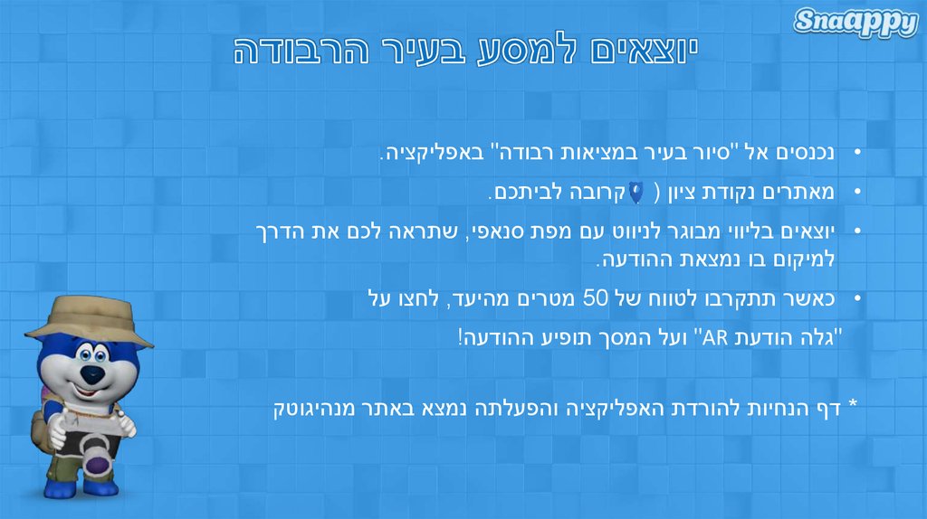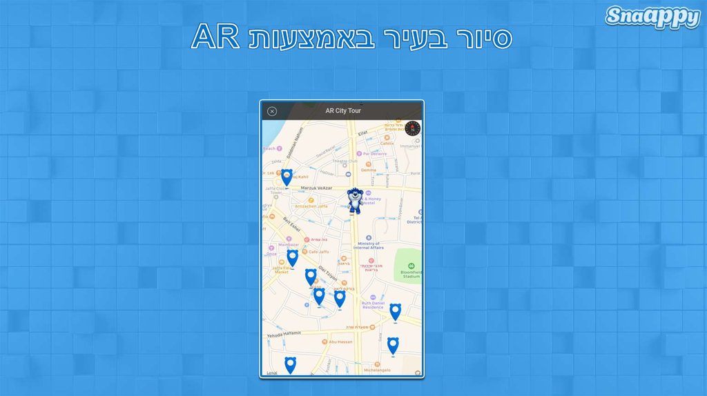 • נכנסים אל "סיור בעיר במציאות רבודה" באפליקציה.• מאתרים נקודת ציון ( ) קרובה לביתכם.