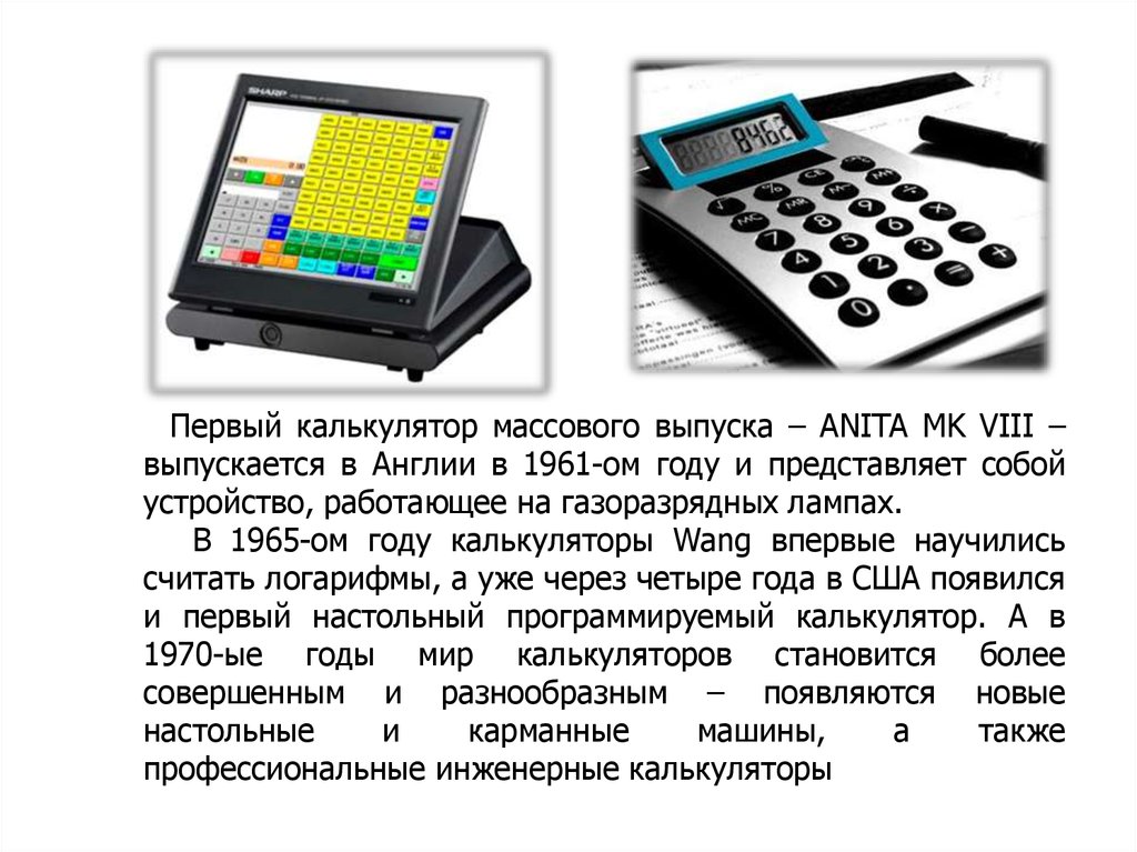 Первый калькулятор массового выпуска – ANITA MK VIII –выпускается в Англии в 1961-ом году и представляет собой
